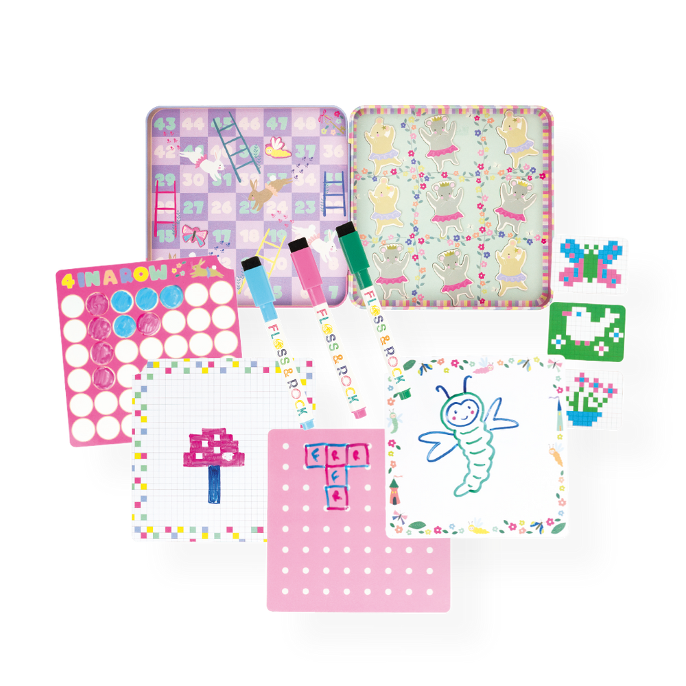Nuestra nueva Caja Magnética de Diversión y Juegos está repleta de diversión para llevar. Descubre 6 actividades y juegos: “Serpientes y Escaleras”, “Tres en raya”, “Pixel Art”, “4 en Raya”, “Puntos y Cajas” y una página para dibujar. Cada caja es reutilizable e incluye piezas magnéticas extraíbles, 3 rotuladores de borrado en seco de colores con gomas de borrar y un dado para jugar.