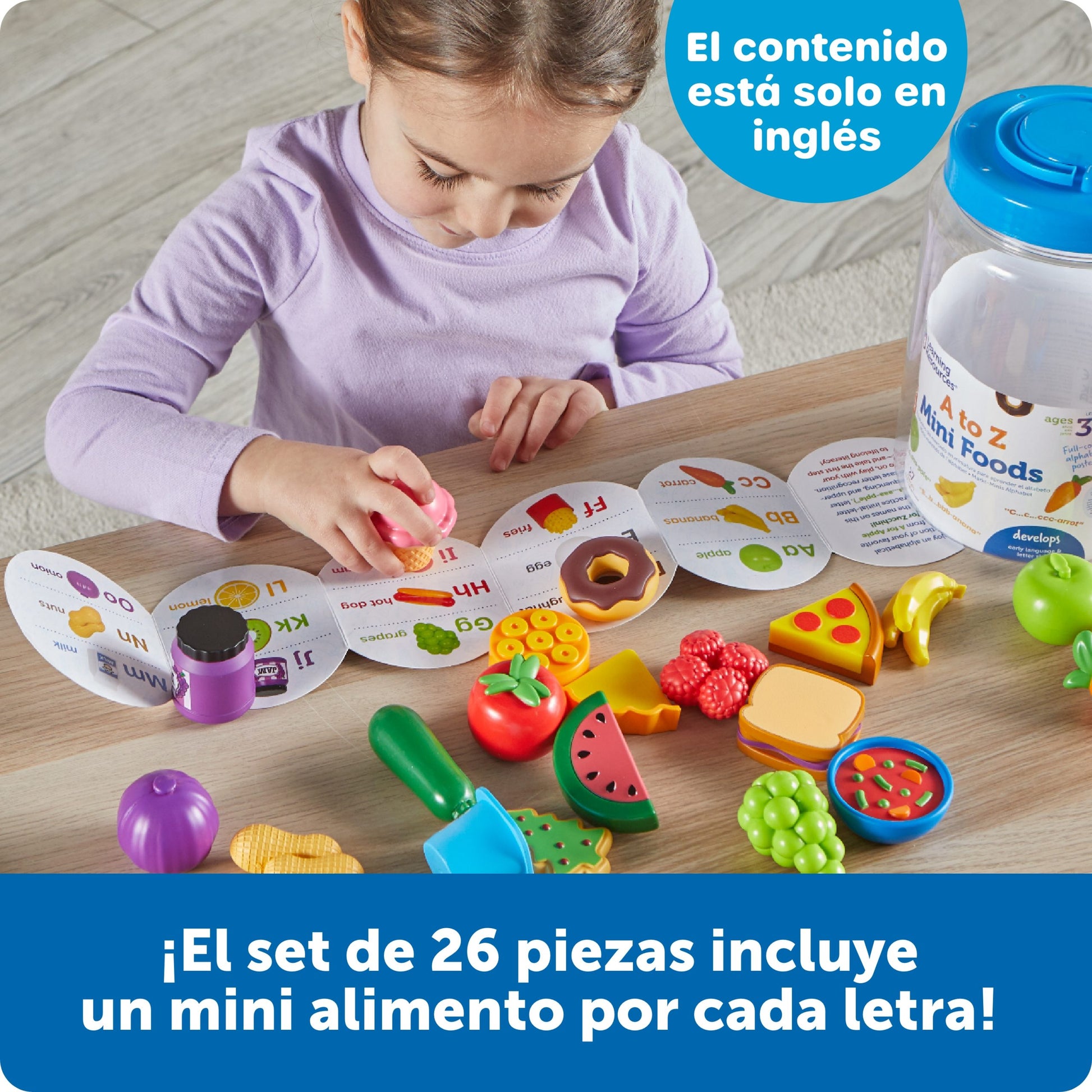 Estos adorables minialimentos contienen todo el aprendizaje del abecedario en un adorable paquete. Cada uno de estos 26 minialimentos de plástico blando corresponde a una letra diferente del abecedario: desde una adorable manzana hasta un sabroso calabacín, ¡es una forma deliciosa de aprender el abecedario! Este set incluye un menú desplegable ilustrado que ayuda a los niños a desarrollar su vocabulario y su imaginación mientras aprenden las letras, además de un cubo de plástico reutilizable para facilitar la limpieza. Edad 3+ | PreK+