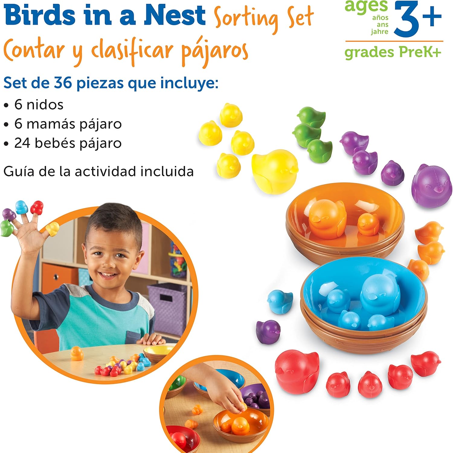 - El conjunto de 36 incluye 24 pájaros tiernos en 6 colores, 6 pájaros de mamá, 6 nidos de color y guía de la actividad