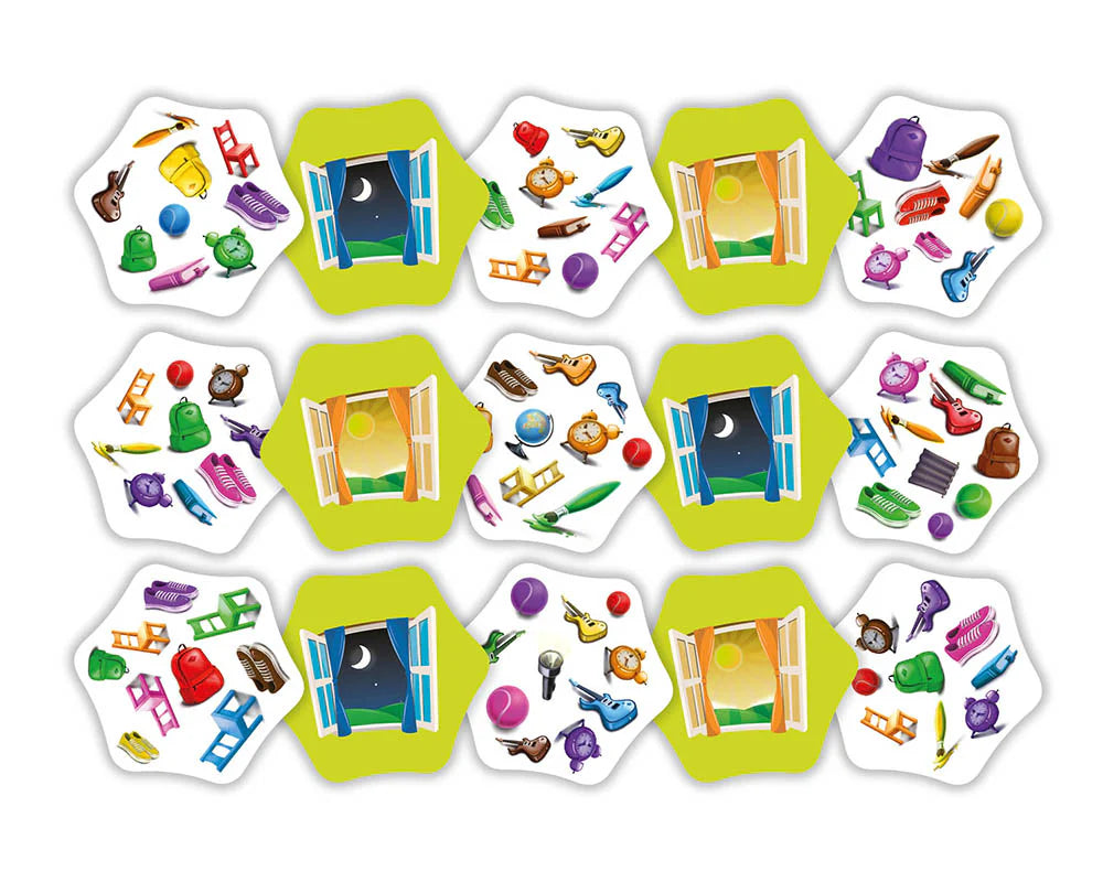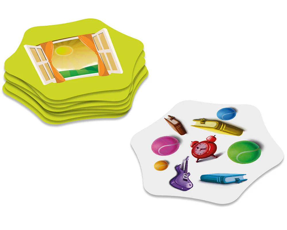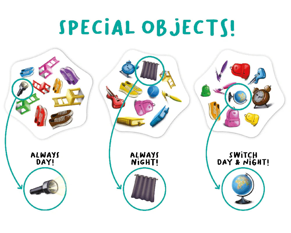 Baraja las cartas y colócalas en el centro de la mesa. Destapa la primera y colócala junto a la pila. Ahora, todos los jugadores tendrán que buscar el objeto o el color que se repite más veces. La carta bocabajo en la pila indicará si se juega de día o de noche. El jugador que acierte se lleva la carta y el que acumule más al final del juego gana la partida.